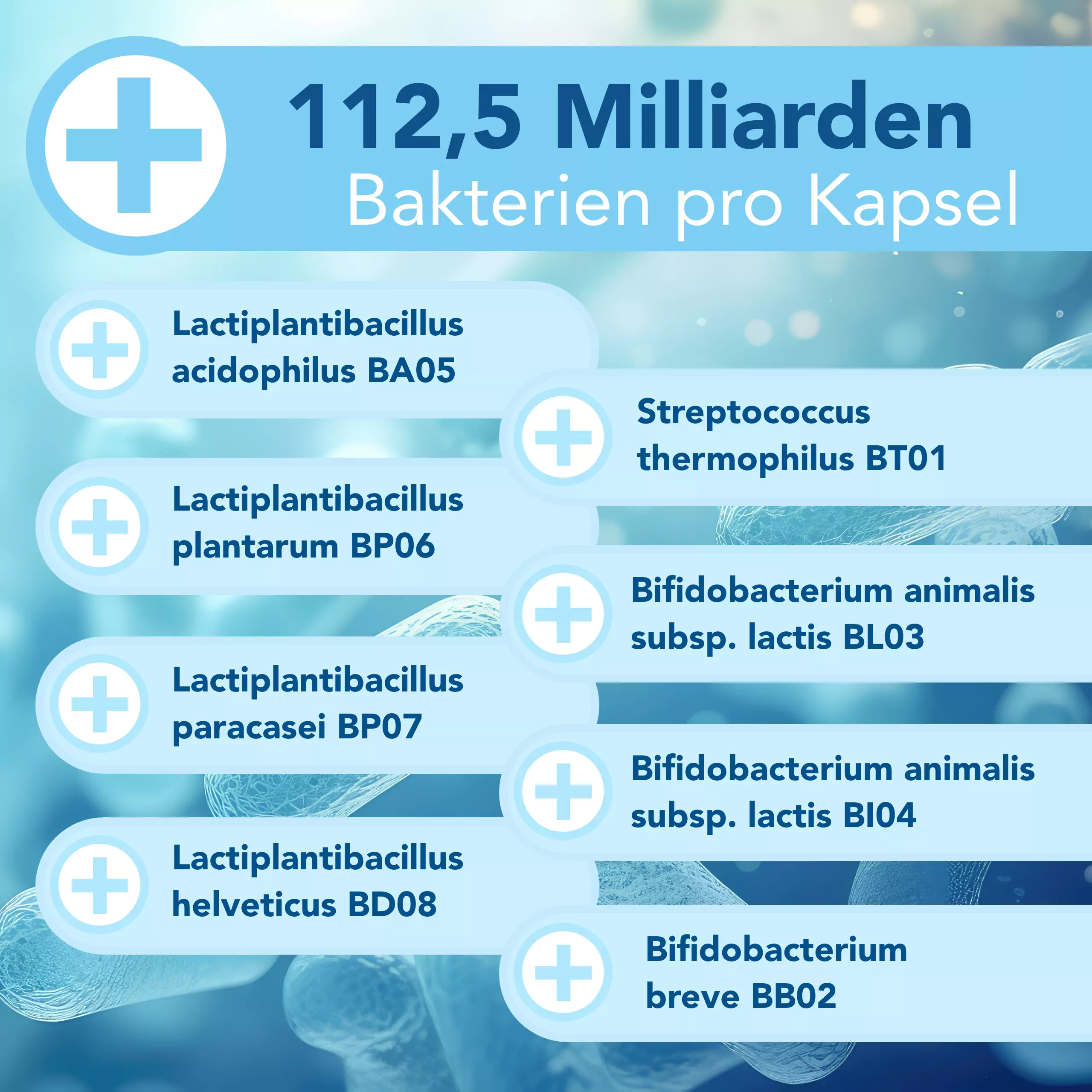 JeJede Kapsel liefert 112,5 Milliarden KBE (koloniebildende Einheiten) aus folgenden Bakterienstämmen: