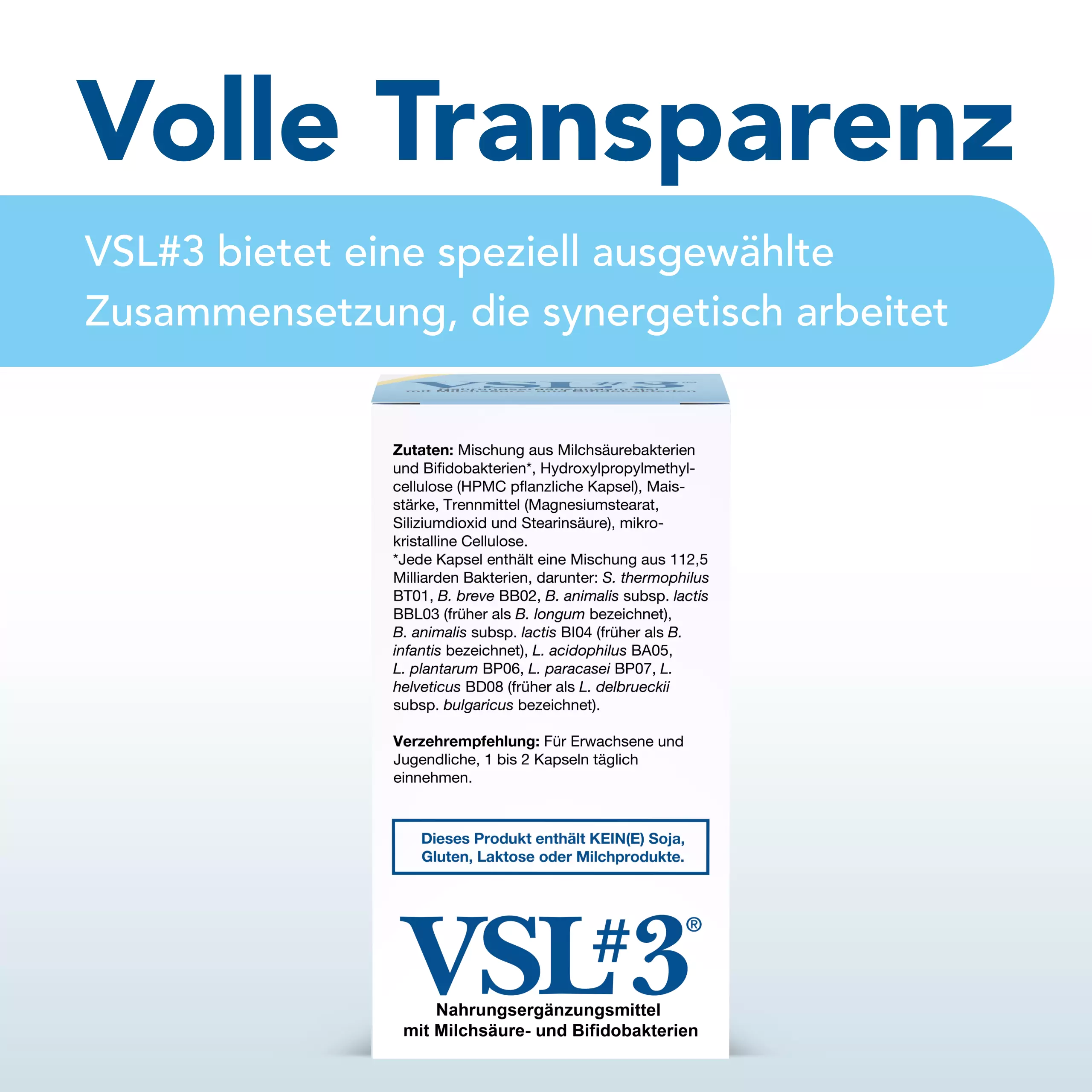 VSL#3® Kapseln sind für eine pflanzenbasierte Ernährung geeignet, nicht gentechnisch verändert (Non-GMO) und frei von Titandioxid, Gluten und Laktose.