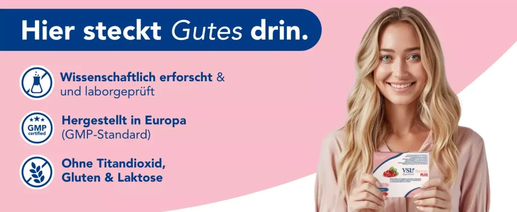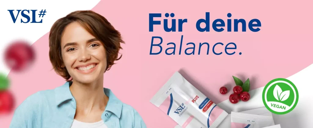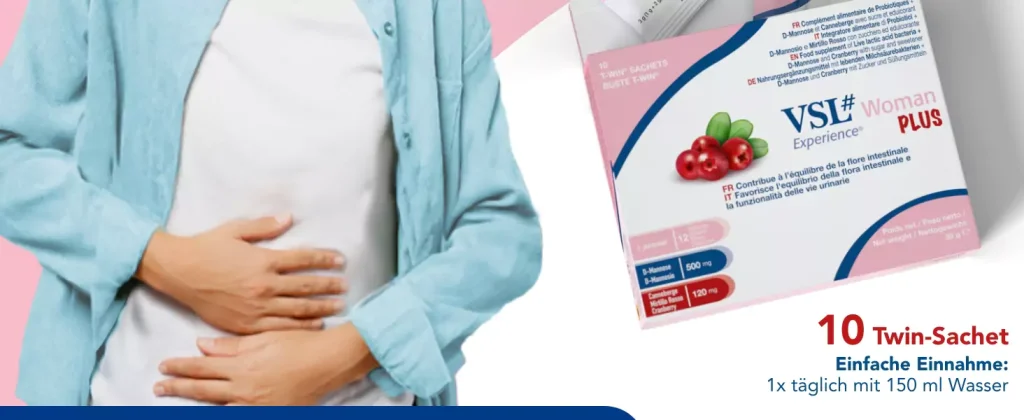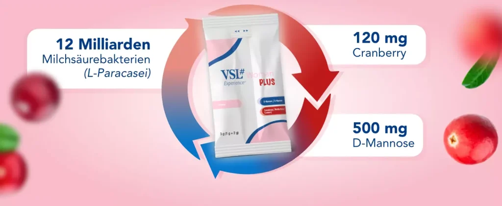 VSL#® Woman Plus ist ein speziell für die weibliche Zielgruppe entwickeltes Nahrungsergänzungsmittel, das einen Tri-Komplex aus lebenden Milchsäurebakterien, D-Mannose und Cranberry-Extrakt kombiniert.