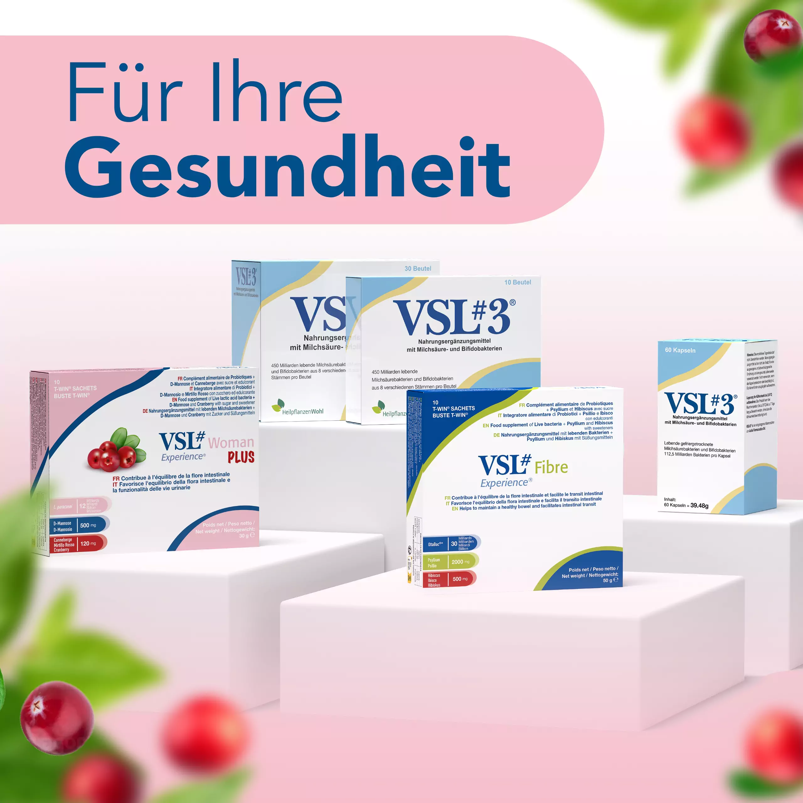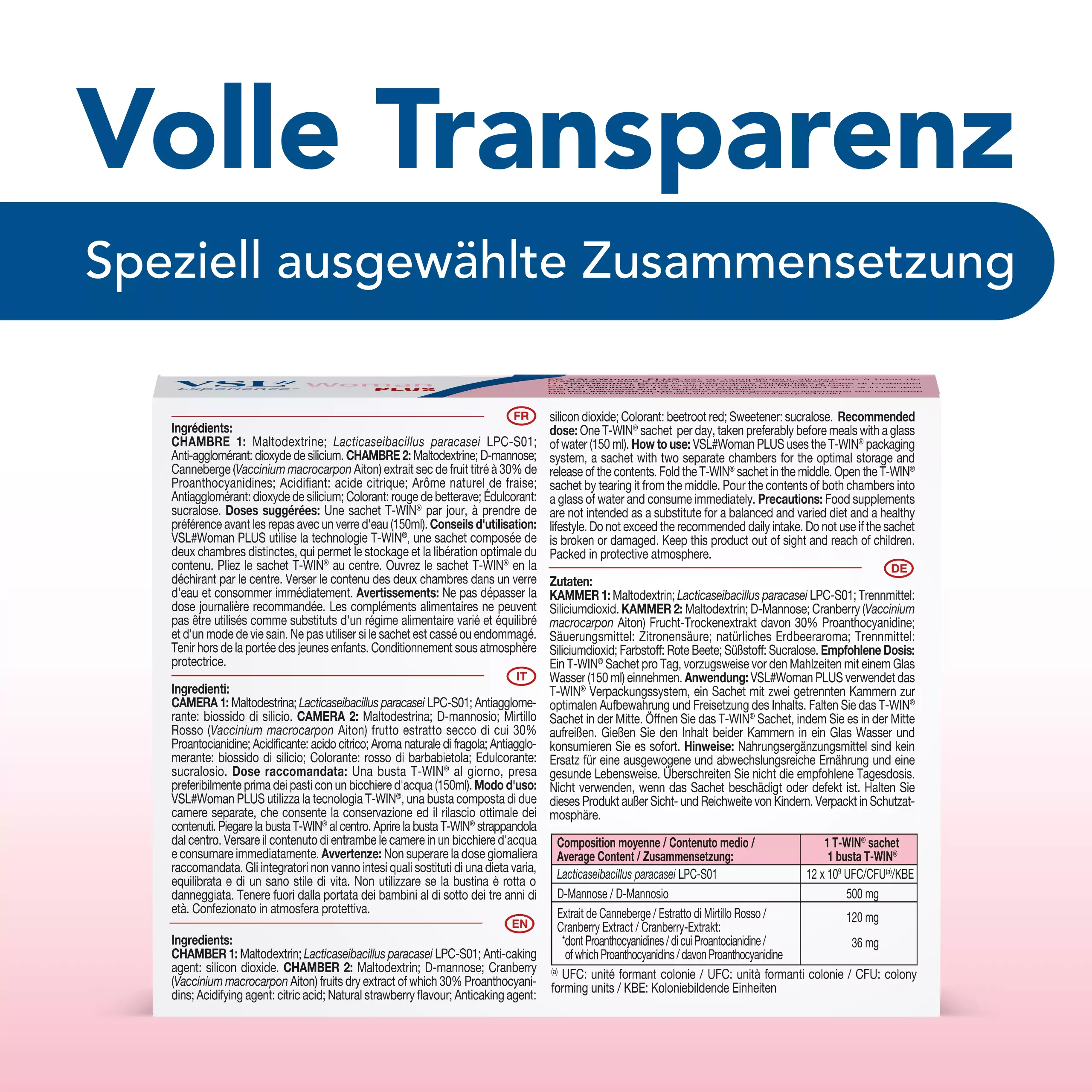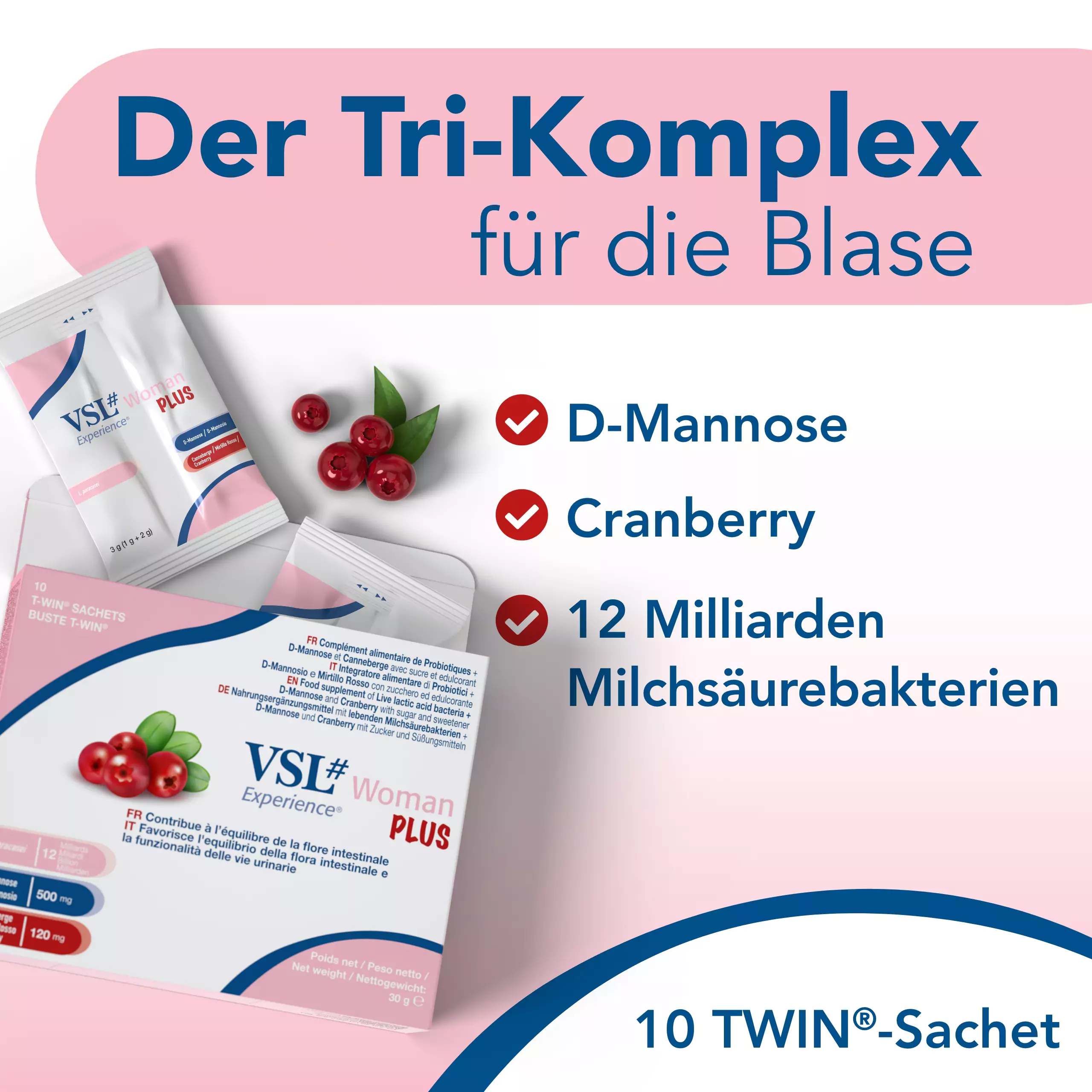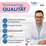 VSL#® Woman Plus ist ein speziell für die weibliche Zielgruppe entwickeltes Nahrungsergänzungsmittel, das einen Tri-Komplex aus lebenden Milchsäurebakterien, D-Mannose und Cranberry-Extrakt kombiniert.